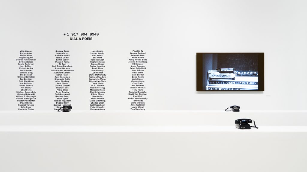 Probabilmente è una mia opinione personale di poeta, ma vedere una sala piena, un museo pieno di persone che si interessano alla poesia è un’occasione rara e preziosa. L’altra sera, all’inaugurazione della mostra “John Giorno: The Performative Word” al MAMbo, ho avuto la netta sensazione che finalmente la gente stesse capendo che la poesia è davvero per tutti. La mostra è la prima retrospettiva istituzionale mai realizzata sull’ampia produzione di Giorno e non solo offre allo spettatore una panoramica generale di tutti i suoi scritti, le sue performance e il suo impegno sociale nel corso della sua vita, ma fa rivivere la gioia e il dolore della sua stessa poesia. Questa vivacità è senza dubbio dovuta in gran parte alla presenza delle voci – la voce di Giorno in diverse forme –, ma anche all’ultima aggiunta al progetto Dial-A-Poem; iniziato nel 1969 con poeti americani, Giorno ha creato una linea telefonica dove chi chiama viene indirizzato a una poesia casuale preregistrata. Ora, componendo il numero +39 051 030 4278, è possibile ascoltare uno dei trentatré poeti italiani selezionati da Caterina Molteni (me compresa). Ciò che il curatore della mostra Lorenzo Balbi è riuscito a fare è davvero notevole, considerando che mostrare il lavoro di un poeta potrebbe risultare austero o difficile. Ma la mostra è calda, accogliente e lascia lo spettatore/ascoltatore pieno di energia.