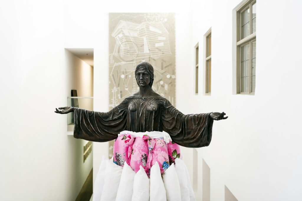 È inevitabile notare come la pedagogia rappresenti quindi per Francisco il più grande stimolo di avanzamento e risorsa creativa, trasformando di conseguenza l’habitat cittadino dell’Avana in un ambiente immersivo per gli studenti, favorendo così modalità di pensiero alternative, assieme a nuove ritualità di insegnamento. In questo contesto, Francisco crea opere luoghi-eventi, collegandoli tra loro anche negli anni successivi, rivalutando il principio della processualità, aggiornandosi e adattandosi a nuovi contesti e alle informazioni raccolte. Ed è proprio la pedagogia a dare avvio al percorso della mostra, con la scultura monumentale Cobijo (2025) raffigurante l’Alma Mater, icona della sapienza, il cui corpo è composto da cuscini che richiamano la protezione dei monumenti in caso di guerra. La scelta di aprire il progetto con quest’opera sottolinea l’autorevolezza delle realizzazioni di Francisco, capace com’è di nutrirsi di studi filosofici, sociali e approfondimenti storici tali da permettergli di raggiungere una libertà critica e creativa senza rimanere intrappolato in sistemi ristretti se non circoscritti. Incrociando sensibilità collettive ed esigenze territoriali come l’artista fa, ogni lavoro non risulta avulso dall’ambiente che lo genera.