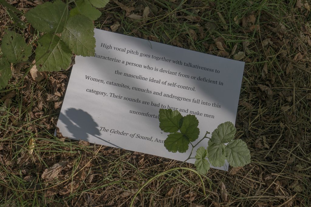 La ricerca di giulia deval (Torino, 1993; vive e lavora a Torino) si colloca in questo ambito di indagine, esplorando le dinamiche trans-specifiche e transculturali del suono vocale, i cliché che lo accompagnano e i pregiudizi uditivi che orientano il nostro modo di riconoscere e attribuire credibilità e autorità. Le sue opere, che l’artista definisce «pratiche di ricerca e creazione», mirano a mettere in luce queste consuetudini per disarticolarle e sovvertirle.