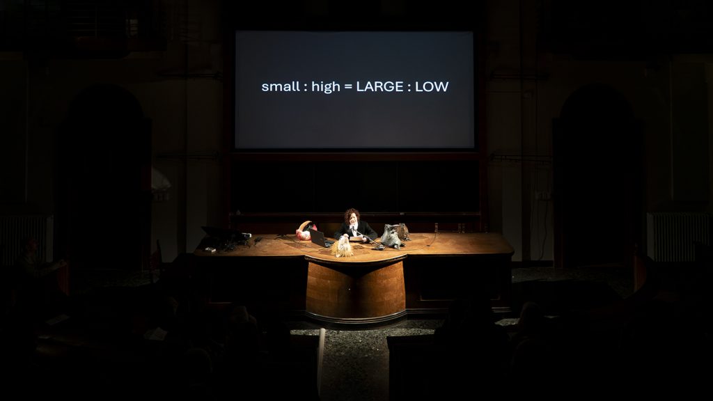 Pitch. Notes on Vocal Intonation è attraversata da un timbro ironico che, mentre espone teorie e analisi, decostruisce il formato stesso della lezione e il suo carattere normativo. deval ricorre a maschere ed esaspera la postura didattica, alternando la spiegazione a brevi incursioni vocali e sonore che, mentre da una parte svelano al pubblico lo scheletro finzionale della dissertatio scientifica, dall’altro lo disorientano, mostrando le possibilità della voce di estendersi e differenziarsi.