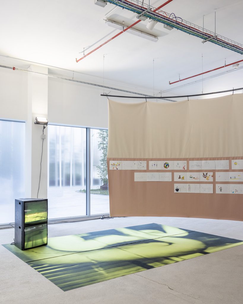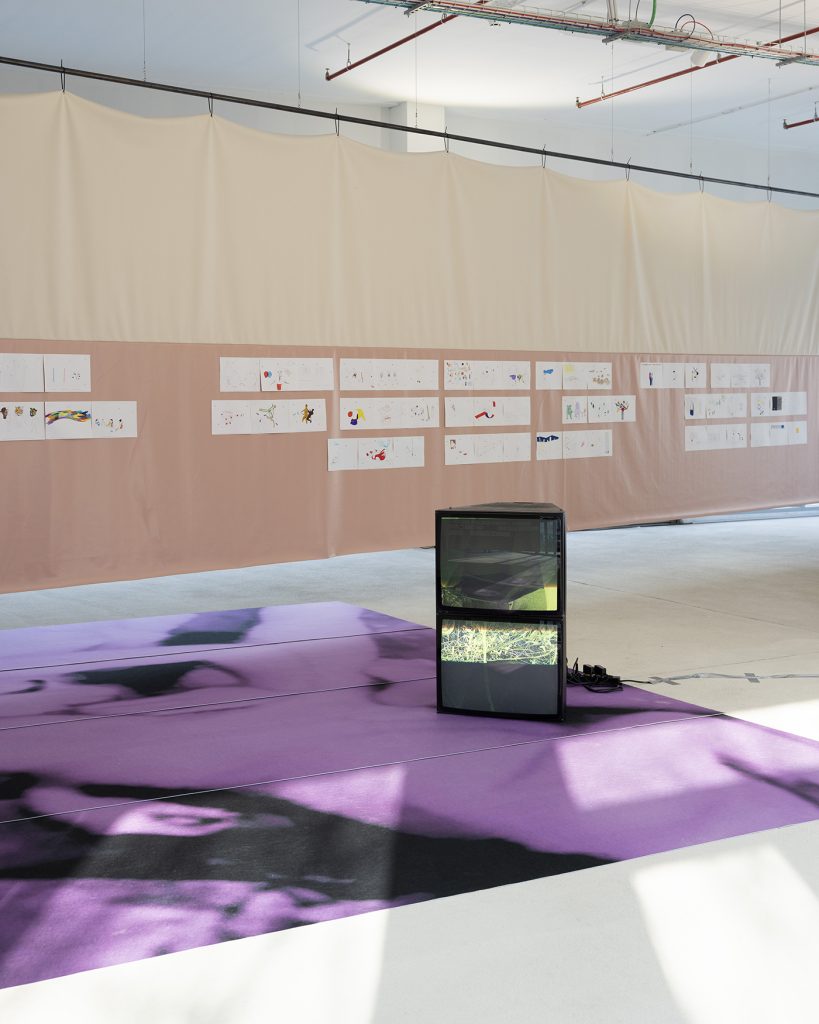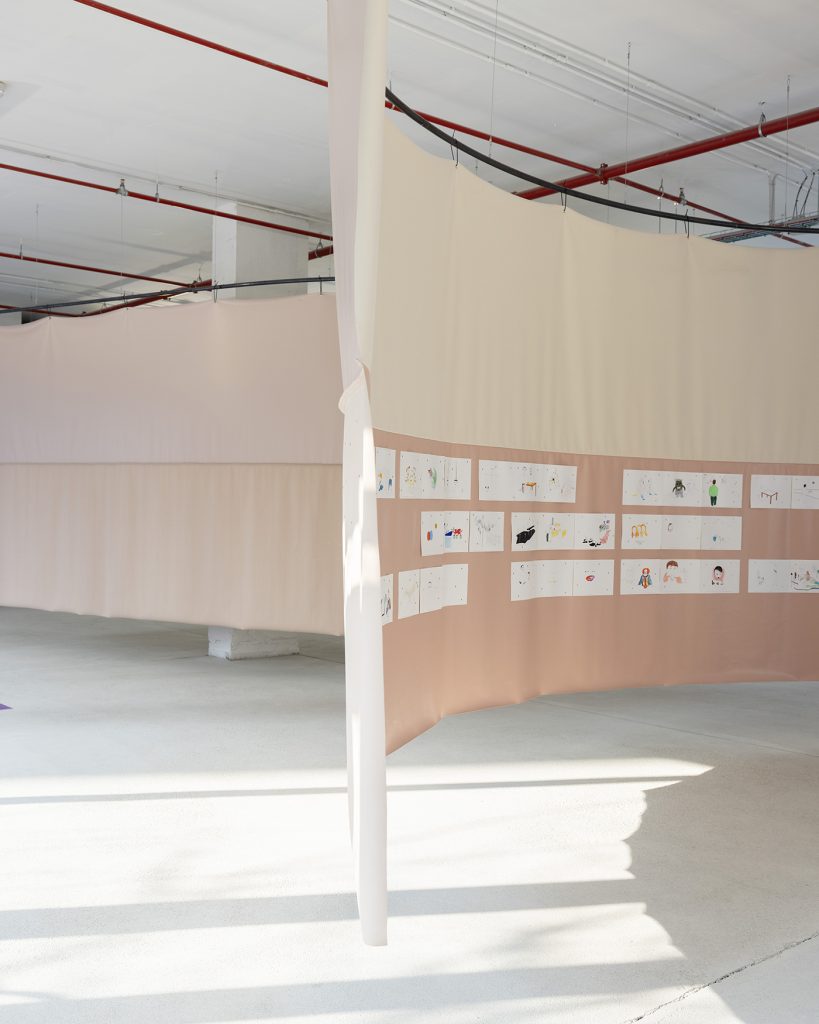 La quantità di disegni rappresenta insieme attrazione e vertigine che costringe l’occhio a fermarsi, a cercare un orientamento in una trama di segni che spaziano dalla geopolitica alle inquietudini più intime, dal macro al micro, inanellando riferimenti e scarti con una spietatezza sorniona che non concede appigli facili. Per vedere davvero questi disegni bisogna avvicinarsi, quasi entrare sotto la pelle delle tende che li proteggono; l’allestimento impone una distanza iniziale e poi la riduce, come se la mostra stessa mettesse in scena il movimento dello sguardo che si fa più acuto quando accetta di esporsi. In questo senso, il display di Specific non è un semplice contenitore ma un organismo che respira insieme alle opere, un’epidermide ulteriore che racconta le diverse sfumature di senso e di possibilità interpretative che attraversano l’intero progetto. Al di là delle differenze anagrafiche, di genere e di linguaggio, Favaretto e Pozzato condividono un’attitudine: partire dalla realtà per immaginarla, sovvertirla, ricontestualizzarla, suggerendo che ciò che ci circonda può essere guardato oltre la superficie della cronaca, oltre la semplificazione mediatica che appiattisce tutto su poli estremi. “Incarnato” diventa allora il tentativo di restituire complessità a temi che spesso vengono ridotti a slogan, di ridare corpo a contenuti indigesti o dati per scontati, chiedendo al pubblico non adesione ma partecipazione, non consenso ma capacità critica. La pelle non si lascia dipingere, ma può essere attraversata; e attraversarla significa accettare che il vedere non sia mai innocente, che ogni immagine porti con sé una responsabilità, che ogni colore sia già un’interpretazione. “Incarnato”, con la sua coreografia di veli, frammenti, segni e superfici, ci ricorda che guardare è un atto complesso, che implica prossimità e distanza, desiderio e pudore, e che forse l’unico modo per restituire dignità alla carne (alla sua ambiguità, alla sua intensità) è sottrarla alle definizioni troppo rapide, lasciarla vibrare nella sua irriducibile, inquieta mescolanza.