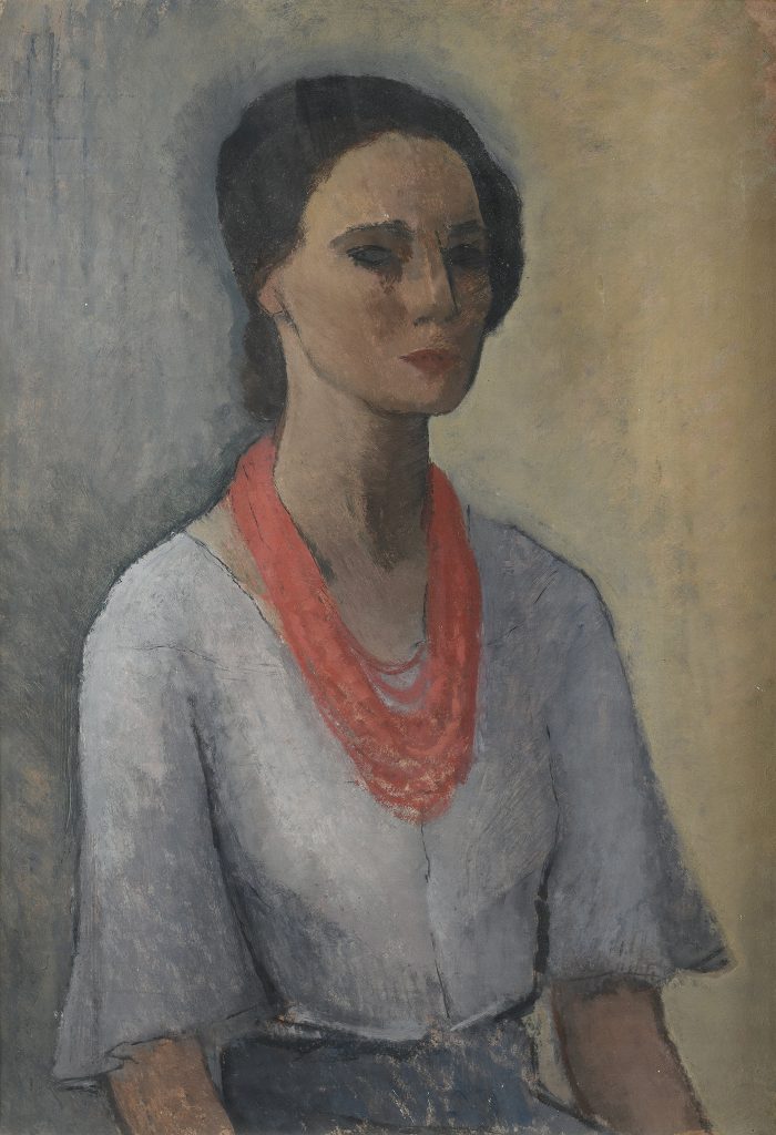 Il primo è un olio su cartone, un classico dipinto da cavalletto, dall’impostazione solida ma aggraziata, che già testimonia l’interesse per una gamma di colori tenui e per un’immagine costruita attraverso linee sottili e vibratili. I contorni della blusa azzurrina sono animati da filigrane che increspano la superficie, mettendo in lieve fremito la compostezza, quasi ieratica, della figura. Nell’insieme, spicca l’accento cromatico della collana di corallo: un rosso cremisi intenso, quasi un pigmento gettato a vivo, che accende l’intera composizione e ne sposta l’equilibrio tonale. La figura, raccolta in una malinconia composta, richiama le atmosfere spente e sospese dei ritratti di certa Scuola Romana, fra tutti Emanuele Cavalli. Gli occhi, velati da un grigio fumo che si espande fino a obnubilare le pupille, le conferiscono uno sguardo vuoto e insieme profetico, come quello di un cieco molto lucido, forse memore degli occhi senza tempo delle figure di Amedeo Modigliani.