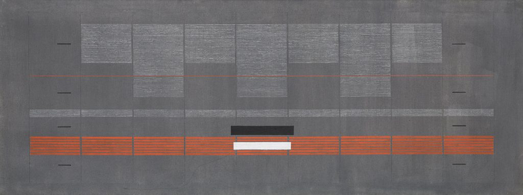 Il percorso espositivo è tuttavia interamente dedicato alla sola voce di Lazzari, nel libero dispiegarsi della sua attività: talvolta costruito per contrappunti visivi – come nella sala iniziale – altrove articolato secondo accostamenti cromatici o scansioni cronologiche. Emblematica e più omogenea la sezione dedicata alle tele informali di fine anni Cinquanta, dove la tensione geometrica sembra assorbita da un interesse per la gestualità segnica e la materia, fatta di superfici che evocano muffe, catrami, lastre arrugginite, prima che la ricerca approdi alle più note e compatte partiture del minimalismo geometrico e musicale degli anni Settanta, che percorrono un gran nucleo dell’esposizione. Qui, le superfici tornano a essere piatte, luogo di campiture schematiche che giocano con i dettami del costruttivismo. Sono variazioni di linee nette su sfondi neutri, costruzioni di sistemi e partiture melodiche la cui simmetria, il rigore da carta millimetrata, è di volta in volta prontamente disattesa dall’inserimento di ordini ulteriori, che sovvertono l’apparente unità del complesso, pur perpetrandone una ferrea armonia.