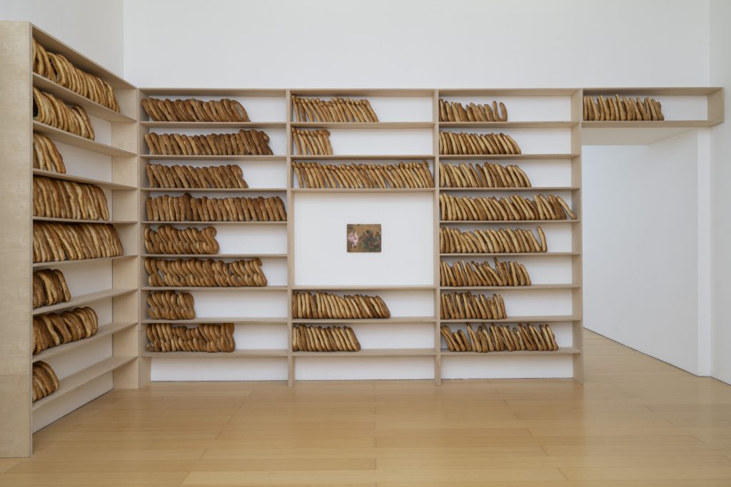 Untitled (Bread Library) (2025) propone un’ulteriore tassonomia: più serie di pagnotte, disposte per gruppi alfabetici, su scaffalature. Sono lettere di un alfabeto componibile e privo di un apparente significato. Eppure l’odore del pane attiva una memoria emotiva condivisa da tutte le culture: è un simbolo che prescinde dalle lingue e dai loro specifici linguaggi. Come il pane, molti degli oggetti presenti nelle opere di Aran sono comuni e ordinari: biscotti, libri, palline da gioco, barattoli, poltrone, monetine. È il loro uso o la loro materialità ad agire come un dispositivo di attivazione emotiva, capace di evocare memorie individuali o collettive. La tensione tra linguaggio verbale e linguaggio emotivo costituisce, di fatto, un altro nodo della pratica dell’artista, poiché evidenzia un limite invalicabile nelle relazioni normate da logiche che aspirano a essere chiare e univoche a priori.