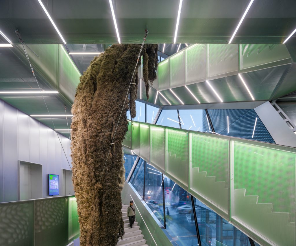 Concordo sul fatto che l’integrazione tra le due strutture sia riuscita. Il New Museum ha finalmente spazio per respirare e soprattutto le opere esposte sono molto più valorizzate di prima. Ho preso una delle scale interne dell’edificio preesistente fino al quarto piano e sono rimasto piacevolmente sorpreso da quello che ho visto. Oltre il perimetro originario si apre un’altra sala in cui si trova una scultura di Tau Lewis del 2024 installata in modo impeccabile che si inserisce alla perfezione nel nuovo edificio. Al piano di sopra, due sculture simili a meduse, riempite di elio e realizzate da Anicka Yi, fluttuano sopra le teste dei visitatori, accentuando l’ariosità del nuovo spazio