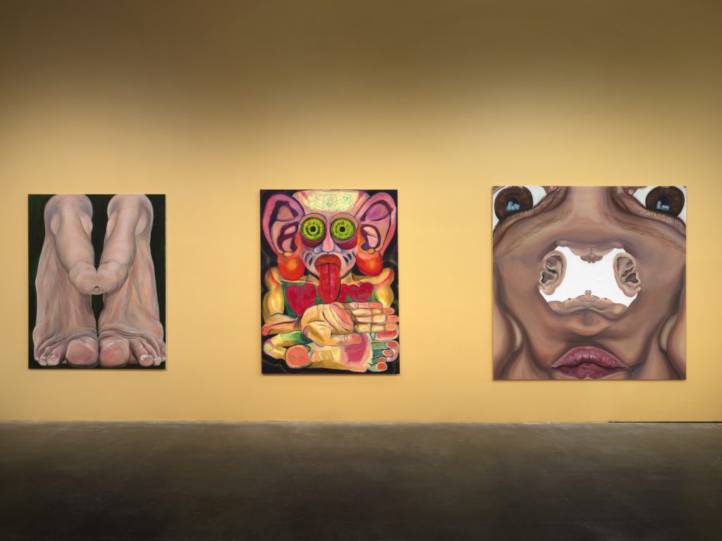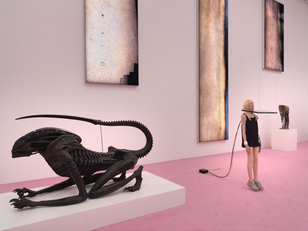 [AG] Eppure, ci sono opere ben più sconvolgenti di quel film in “New Humans”, una mostra che attinge di frequente alla fantascienza e all’horror, talvolta anche in modo esplicito. È il caso di Necronom 2005 (Alien-III-Model)(1990-2005) di H.R. Giger, che mostra una creatura inginocchiata con la coda che termina in un aculeo. Questo essere, che richiama da vicino gli extraterrestri concepiti da Giger per la saga di Alien, si trova qui a poca distanza da una straordinaria scultura di Ivana Bašić, in cui una figura dall’identità di genere ambigua sembra sciogliersi in una sostanza liquida. Altrove la mostra offre al visitatore un’autentica estetica da body horror: in un dipinto memorabile, Jana Euler trasforma un paio di piedi in peni non circoncisi; in una scultura di Hans Bellmer, la gamba di una bambina è innestata su un torso dalle molteplici mammelle; infine, un notevole dipinto di Maina-Miriam Munsky raffigura il parto come una massa di carne isolata da una struttura quadrata.
