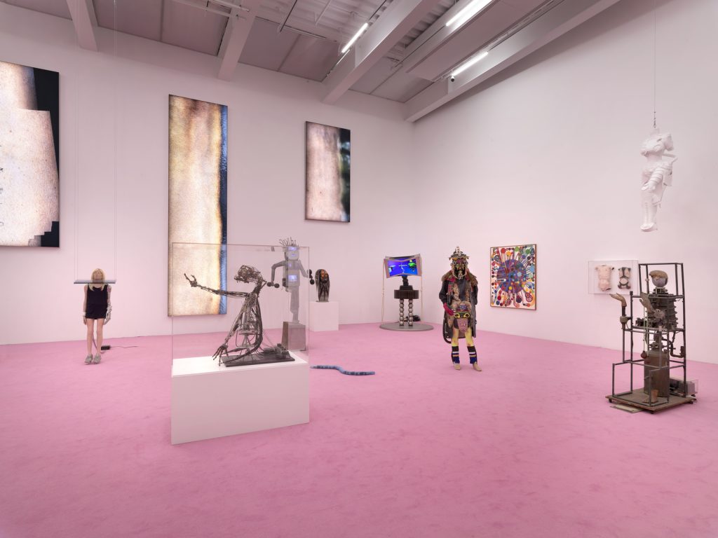 Queste opere trovano un toccante contrappunto nella scultura di Paul Thek tratta dalla serie Technological Reliquaries, in cui un arto dipinto di grigio giace all’interno di una teca in Plexiglas, parzialmente coperto da un pezzo di stoffa e da una parrucca. Per realizzarla, l’artista ha tratto ispirazione dai reliquiari cattolici, che spesso conservano parte del corpo di un santo, applicando questo modello alla carneficina a cui aveva assistito durante la guerra del Vietnam. L’opera è inclusa nella sezione intitolata Hall of Robots, la più dinamica tra tutte quelle della mostra. Salendo ancora, dopo esserci lasciati alle spalle il video Da Vinci di Yuri Ancarani, ci si imbatte nel notevole contributo di Precious Okoyomon per approdare infine in questa sala, dove sembra davvero che i robot abbiano preso il sopravvento. Conviene fare attenzione a non calpestare il serpente robotico di Pamela Rosenkranz che striscia sulla moquette rosa della sala.