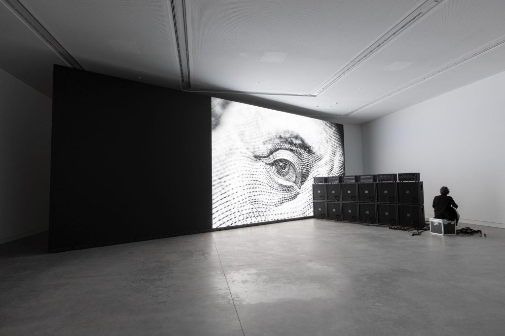 Marco Fusinato La performance continua fino all’ultimo giorno della mostra, perché tutto ciò che inserisco nel sistema – tutto quello che suono – viene catturato e poi riprodotto ventiquattr’ore su ventiquattro. Continua a girare, a ritornare, a essere riattivato. Quando il museo chiude e il pubblico se ne va, il suono continua comunque a generarsi.