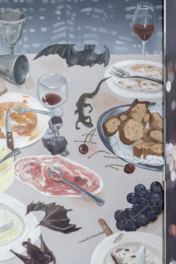 Stanze nella stanza, in cui tavole un tempo imbandite sono ora abitate da presenze grottesche e misteriose che si appropriano dei resti, come in What Ever Happened o Everything Will Happen. I resti diventano residui emotivi di ciò che è stato: il tempo è sospeso, in uno scenario da after party. Tutti hanno lasciato la stanza, la cena è ancora sulla tavola, e piccole creature fantastiche arrivano a nutrirsi di ciò che resta.