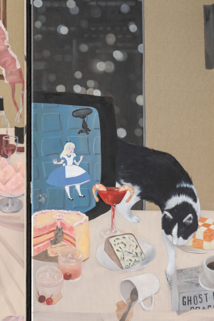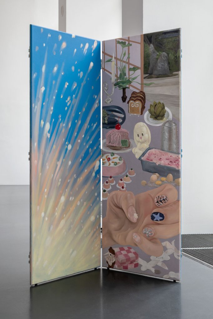 La mostra “I’ll miss you when I scroll away”, inaugurata in occasione della Milano Art Week e della Milano Design Week, e curata da Lucrezia Calabrò Visconti, si articola in sei paraventi modulari, sproporzionatamente lunghi e dipinti su entrambi i lati, che costruiscono un percorso attraversabile di pareti labirintiche. Ne emerge un collage visivo composto da immagini provenienti da ricettari vintage, riviste di moda, internet, film, screenshot e frammenti della quotidianità dell’artista: visioni parziali, deformate, intercambiabili, simili ad allucinazioni. Le tavole imbandite non sono più luoghi di condivisione, ma superfici attraversate e contaminate. In questo paesaggio frammentato, la dimensione domestica e conviviale si trasforma in un teatro perturbante. L’immaginario richiama quello delle grottesche, motivi decorativi mostruosi, che da elementi ornamentali diventano progressivamente protagonisti della composizione, occupando la scena e alterando le gerarchie visive.