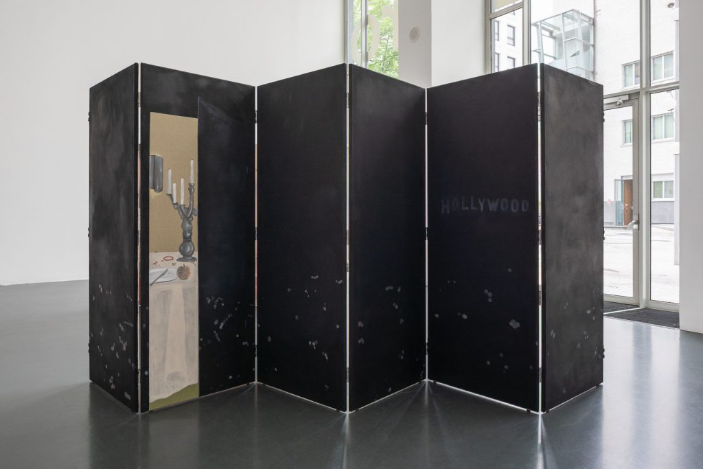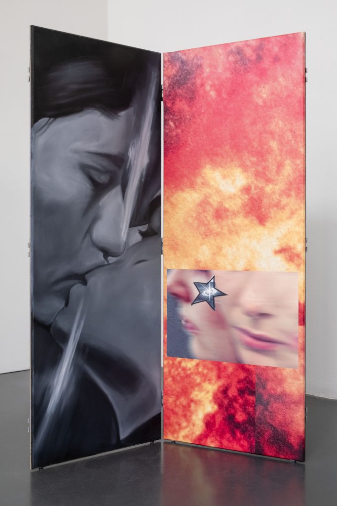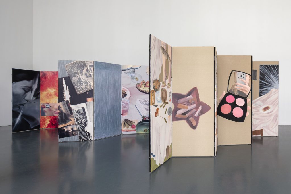 L’artista spiega così la struttura del lavoro: «quando Lucrezia mi ha invitata a lavorare all’Istituto, mi ha chiesto di evitare una mostra di pittura tradizionale: lo spazio non si presta a opere semplicemente appese alle pareti. È stata per me l’occasione di spingere ulteriormente la dimensione installativa della mia pratica, ampliando il lavoro nello spazio e costruendo ambienti in cui le immagini potessero essere attraversate e abitate. Da tempo volevo lavorare sui paraventi. Nella mia pittura ho sempre costruito falsi interni e superfici che si sfondano, come porte o passaggi, per suggerire che esista sempre un altro livello dell’immagine. I paraventi mi permettevano di portare questa logica nello spazio, trasformando la pittura in qualcosa di attraversabile, quasi immersivo. Abbiamo mantenuto i pannelli il più possibile modulari, così da poterli spostare e riorganizzare. Anche il processo è stato fondamentale: ho dipinto tutto in situ, per due mesi, e ogni pannello finito entrava immediatamente nello spazio, generando nuove combinazioni. Era come costruire un puzzle, un collage in continua trasformazione. Alcune sequenze restano più stabili, perché hanno un senso preciso tra fronte e retro; altre possono cambiare. Questo riflette il tema della mostra: uno scorrimento continuo di immagini, in cui non sai mai cosa arriverà dopo. Un amico, una guerra, una pubblicità, tutto coesiste senza gerarchie. È un accumulo visivo che rispecchia il modo in cui oggi consumiamo le immagini».