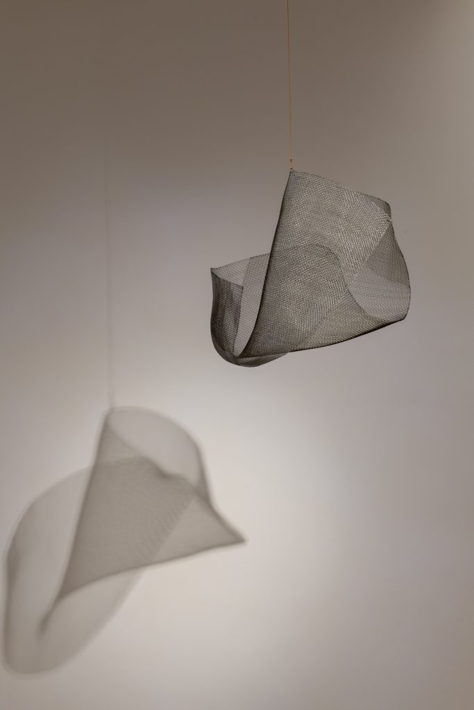 La mostra prosegue con una selezione di opere in sospensione. Nelle Macchine Inutili il movimento dell’aria trasforma i corpi in alluminio, legno o cartoncino in entità sospese che sfuggono al controllo dell’artista. Concavo-Convesso è una rete metallica che, attraversata dall’aria, produce fluide ombre di forme primordiali, come nuvole o conchiglie. I Filipesi infine, solidi geometrici vuoti delineati da esili linee appese al soffitto, si attivano tramite la forza di gravità e il peso dei materiali. In questi lavori l’aria, insieme ai suoi elementi interni, diventa regista indiscussa e detiene un potere arbitrario che neanche il creatore dell’opera possiede più. Slegate da ogni controllo, le opere modificano costantemente il proprio aspetto.